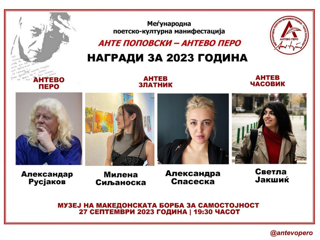 Во пријатна и емотивна атмосфера на 27 септември 2023 година, во Музејот на македонската борба за самостојност во Скопје се одржа шестото издание на Меѓународната поетско-културна манифестација „Анте Поповски – Антево перо“. Присутните имаа можност да проследат видео материјали со кус рецитал на академик Анте Поповски, но и снимки од негови песни во интерпретација на артистката Софија Гогова Врчаковска. На присутните, во име на жири-комисијата, се обрати д-р Атина Цветаноска, а со искрени и емотивни говори се обратија и добитниците на наградите – Александар Русјаков, Милена Сиљаноска, Александра Спасеска и Светла Јакшиќ. По доделувањето на наградите се одржа и поетско читање, во кое освен наградените автори зедоа учество и неколку други учесници на годинешниот конкурс. Им благодариме на сите учесници и гости што со своето присуство ја збогатија манифестацијата.
