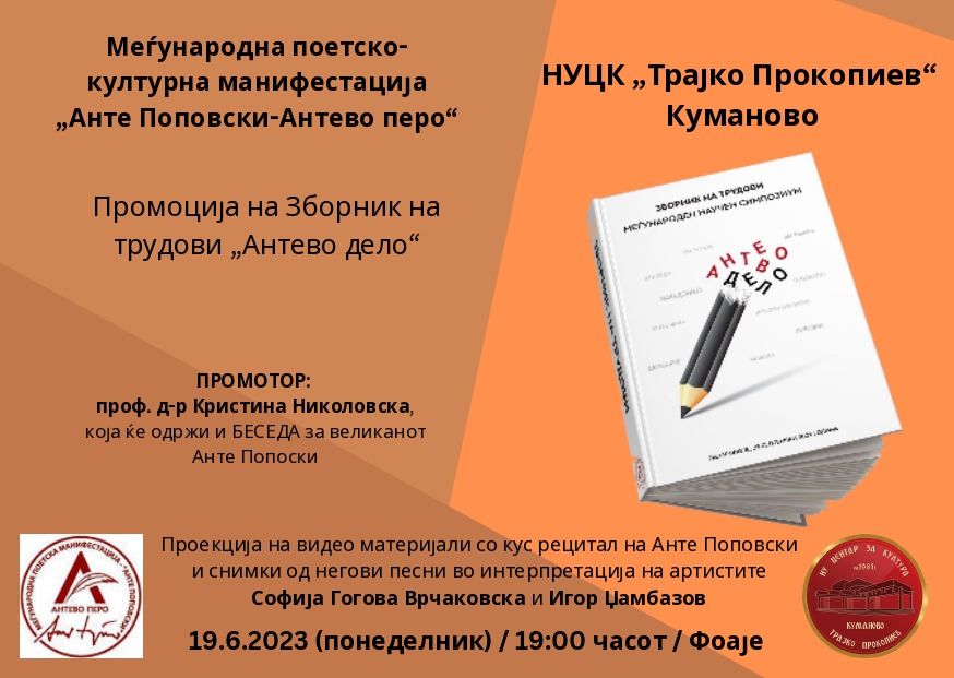 Во годината кога се одбележуваат 90 години од раѓањето на македонскиот поетски маг, Анте Поповски, во Лазарополе се одржа вториот научен симпозиум „Антево дело“ кој оваа година има меѓународен карактер. На симпозиумот учество зедоа: академик Катица Ќулавкова (МАНУ), проф. д-р Ала Шешкен од МГУ „Ломоносов“ од Москва, Руска Федерација, член на МАНУ надвор од работниот состав, проф.д-р Венко Андоновски, дописен член на МАНУ, проф. д-р Кристина Николовска, проф. д-р Емилија Црвенковска, проф. д-р Весна Мојсова Чепишевска, проф.д-р Бојан Ортаков, Филип Фиданоски д-р при Универзитетот во Болоња, Емилија-Ромања, Италија, м-р Бранко Цветкоски, м-р Сузана В. Спасовска, м-р Александра Јуруковска и асс. м-р Иван Антоновски. Зборникот на трудови „Антево дело“ излезе од печат како посебно издание и беше промовиран на 22 мај 2023 година во Скопје и на 19 јуни 2023 година во Куманово.